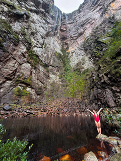 Ali, fazemos uma parada para banho nas águas geladas do poço, em um ambiente totalmente isolado, onde o silêncio e a escala do cânion tornam a experiência ainda mais intensa. É um dos momentos em que o Pati mostra uma das suas faces mais impressionantes, com a vista de baixo para cima revelando toda a grandiosidade da formação. Foi o auge do percurso de 5 dias tanto em trilha quanto em visual. Voltamos para casa do Seu Eduardo para passarmos nossa última noite no vale.