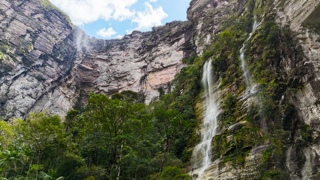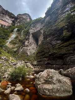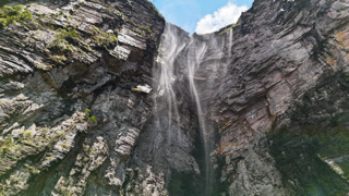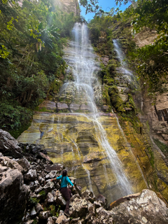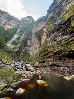 Ao alcançar a base do Cachoeirão, o cenário muda completamente. Somos cercados por paredões gigantescos, com mais de 270 metros de altura, que deixam evidente a dimensão e a força desse lugar. A sensação é de estar muito pequeno diante da imensidão do vale.